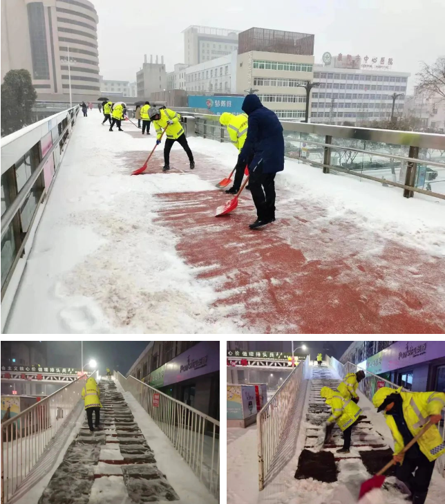 凍雨剛落,迅速安排人員融冰除雪,最大限度防止凍雨凝結成塊。2月20日晚上10點、12點,21日凌晨5點分別出動人員機械除冰除雪,其中市政管理處14支應急隊伍共計272人趕至市區14座人行天橋,橋管中心6支應急隊伍反復在大型橋梁上除冰除雪,建管中心全員出動到襄江大道高架除冰除雪,各公園廣場、綠化養護單位提前做好植物防寒保暖工作,全員出動鏟雪除冰,各安全監管單位加強建筑工地施工安全巡查管控,全力筑牢住建領域安全防線。加強對各住宅小區物業指導和公租房小區設施設備排查,動員352家物業服務企業,發動3000余名物業服務人員開展除冰掃雪,動員所有在襄建筑業企業出動933人、50臺鏟車、13臺裝載機、20臺渣土車對城區主要道路、橋梁及人行道進行除雪作業。