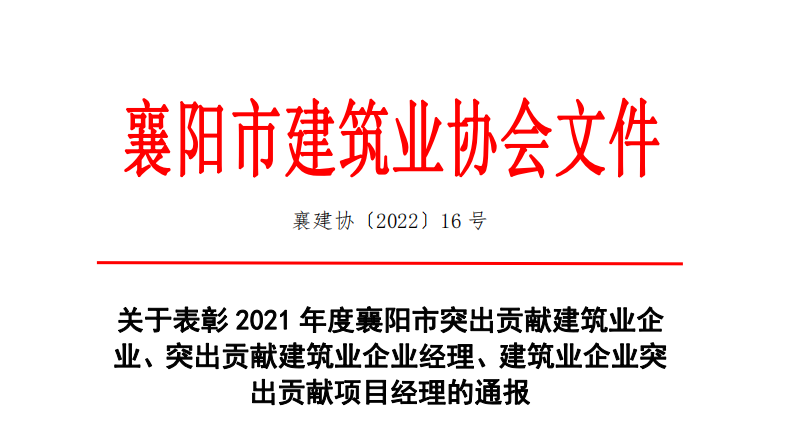 關于表彰2021年度襄陽市突出貢獻建筑業企業、突出貢獻建筑業企業經理、建筑業企業突出貢獻項目經理的通報.p... 【查看全文】