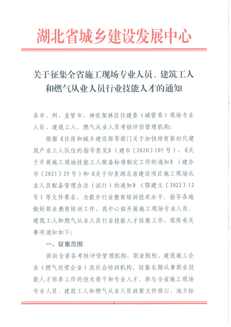 關(guān)于征集施工現(xiàn)場(chǎng)專業(yè)人員、建筑工人和燃?xì)鈴臉I(yè)人員職業(yè)技能人才的通知