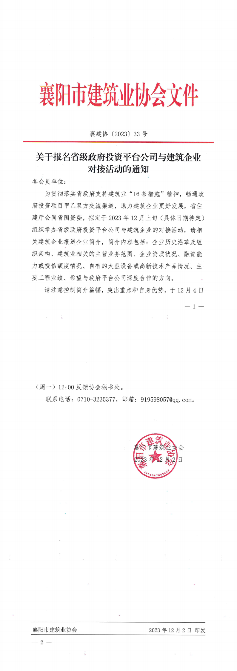 為貫徹落實省政府支持建筑業(yè)“16條措施”精神,暢通政府投資項目甲乙雙方交流渠道,助力建筑企業(yè)更好發(fā)展,省住建廳會同省國資委,擬定于2023年12月上旬(具體日期待定)組織舉辦省級政府投資平臺公司與建筑企業(yè)的對接活動,請相關(guān)建筑企業(yè)報送企業(yè)簡介,簡介內(nèi)容包括:企業(yè)歷史沿革及組織架構(gòu)、建筑業(yè)相關(guān)的主營業(yè)務(wù)范圍、企業(yè)資質(zhì)狀況、融資能力或授信額度情況、自有的大型設(shè)備或高新技術(shù)產(chǎn)品情況、主要工程業(yè)績、希望與政府平臺公司深度合作的方向。