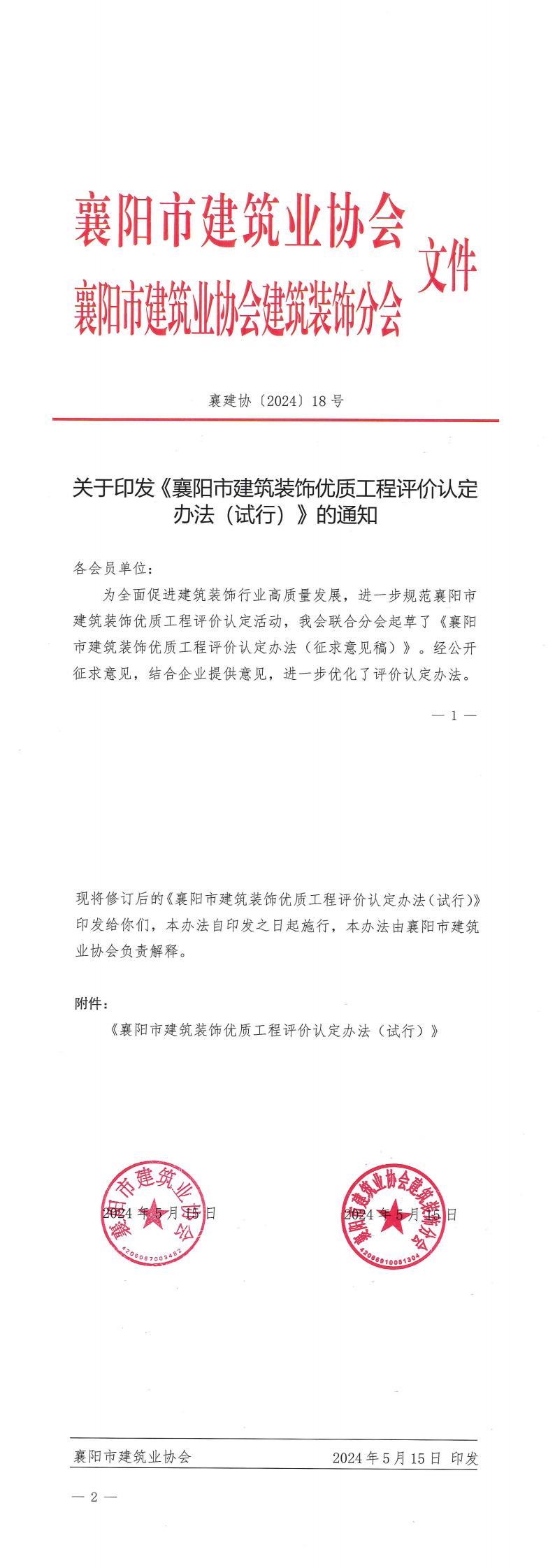 關(guān)于印發(fā)《襄陽市建筑裝飾優(yōu)質(zhì)工程評價認(rèn)定辦法(試行)》的通知