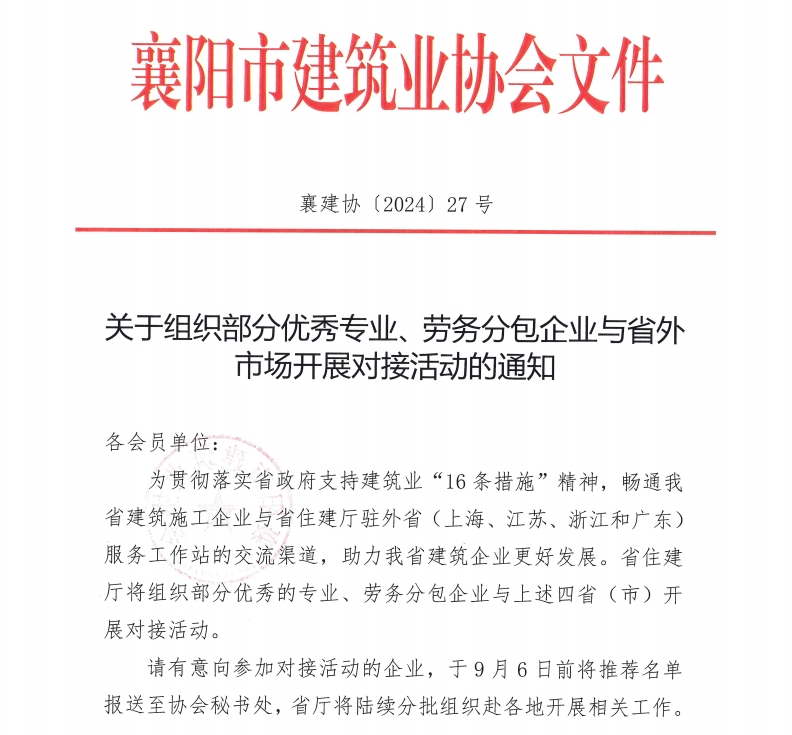 關(guān)于組織部分優(yōu)秀專業(yè)、勞務(wù)分包企業(yè)與省外市場(chǎng)開展對(duì)接活動(dòng)的通知