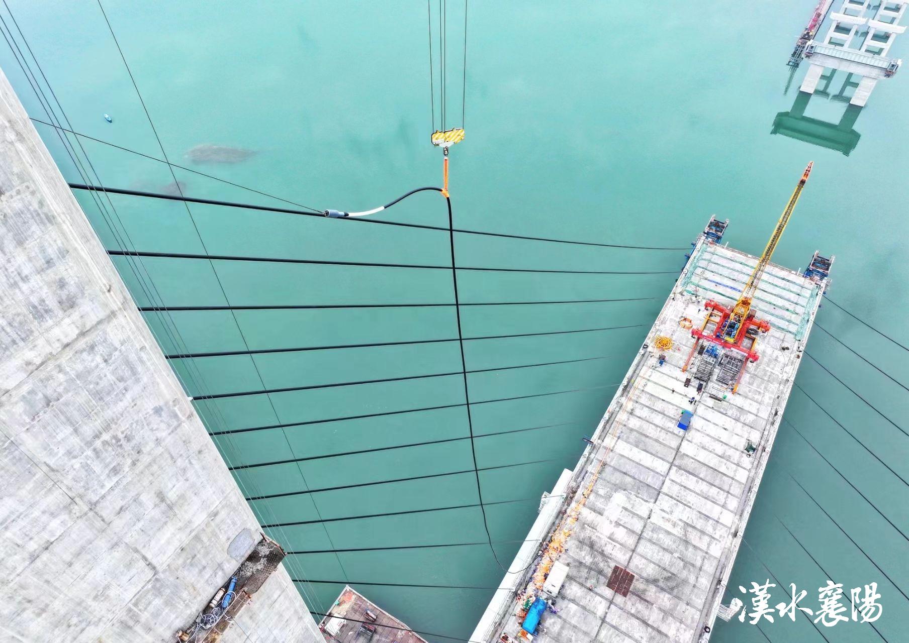 4月7日,中交二航局施工人員正在牛首漢江特大橋安裝斜拉索。