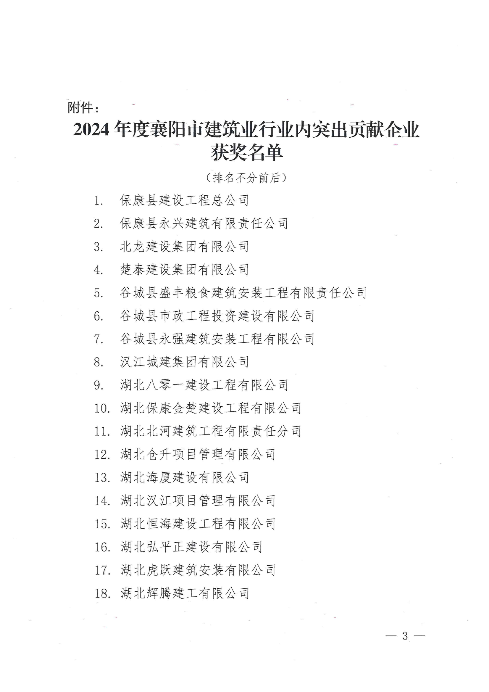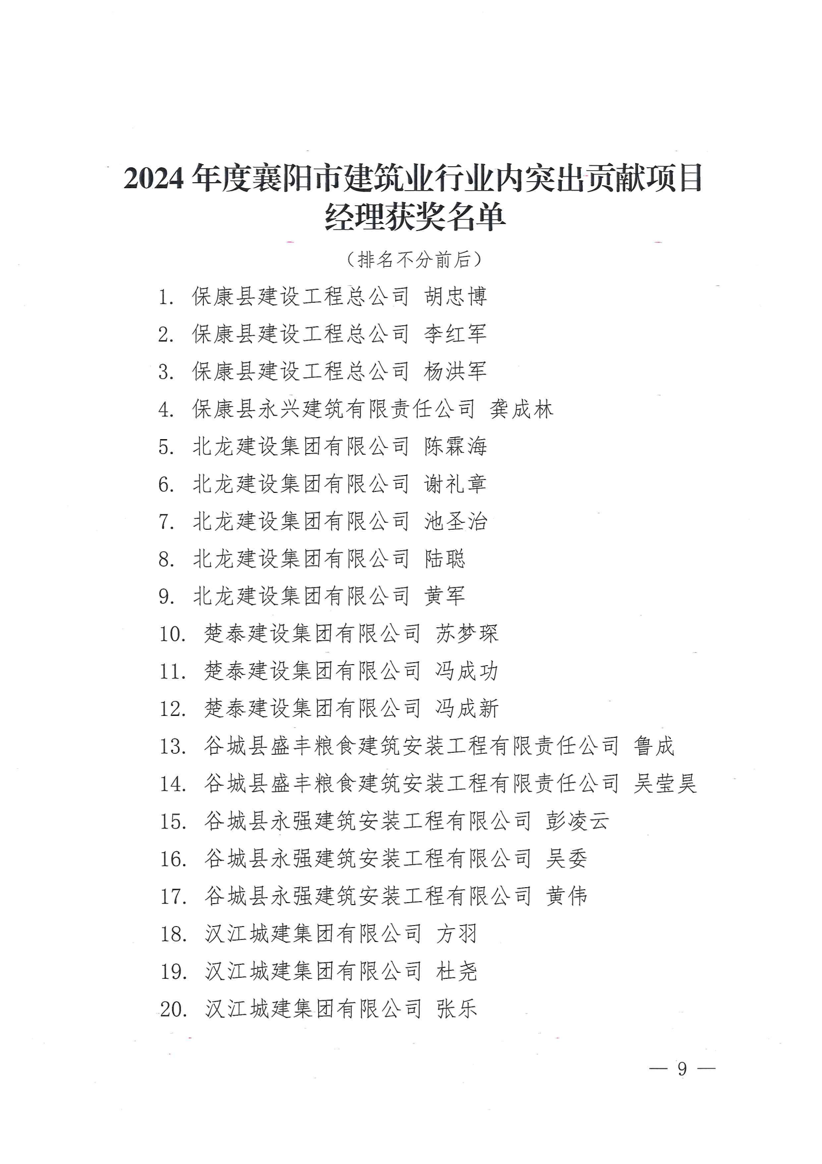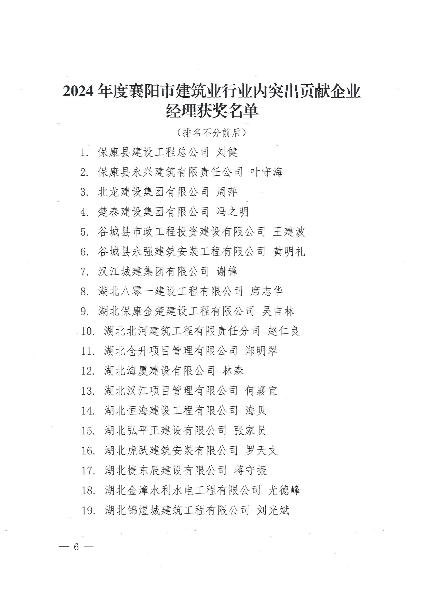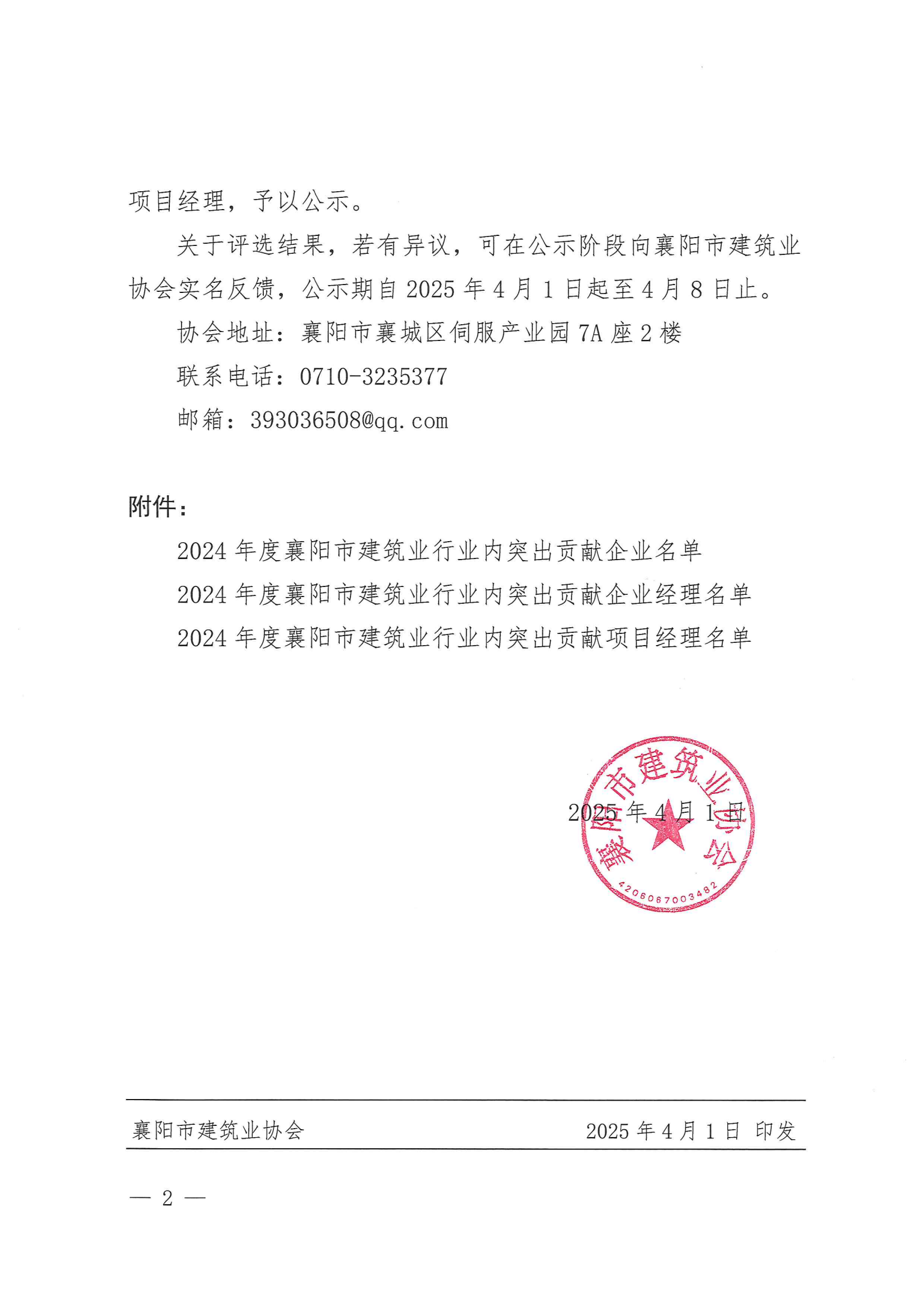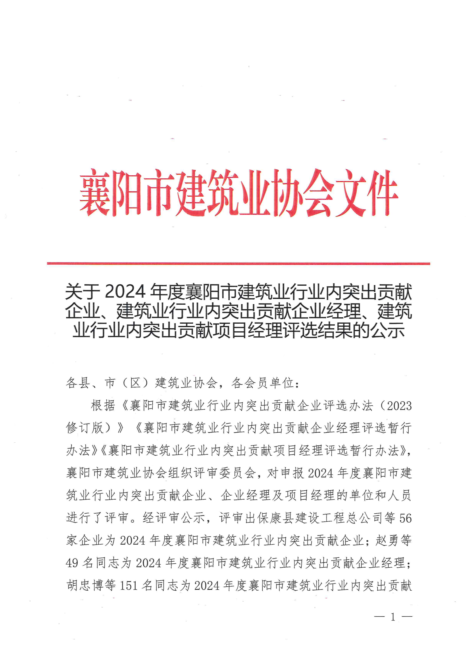 關于2024年度襄陽市建筑業行業內突出貢獻企業、建筑業行業內突出貢獻企業經理、建筑業行業內突出貢獻項目經理評選結果的公示