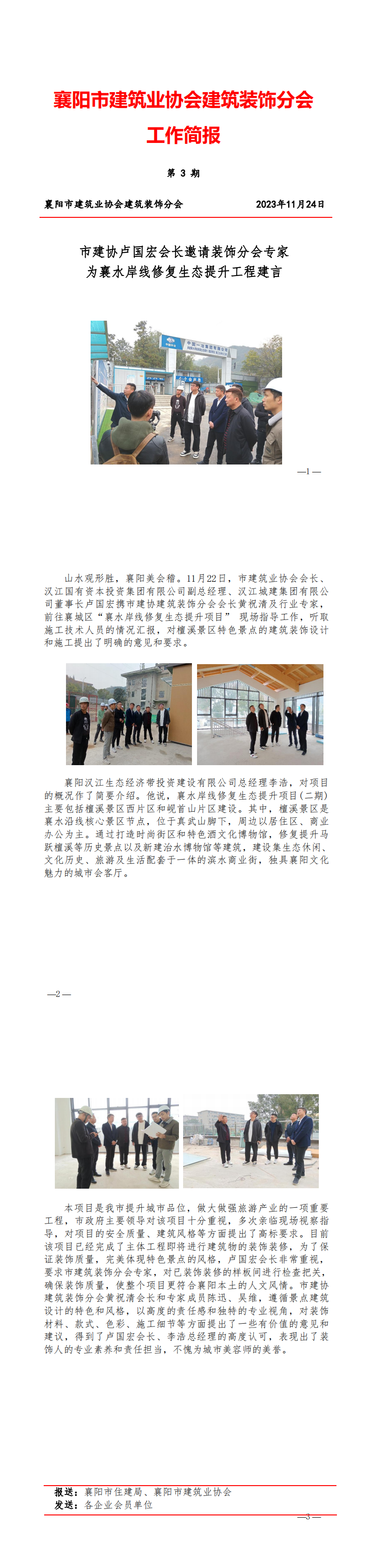 山水觀形勝,襄陽(yáng)美會(huì)稽。11月22日,市建筑業(yè)協(xié)會(huì)會(huì)長(zhǎng)、漢江國(guó)有資本投資集團(tuán)有限公司副總經(jīng)理、漢江城建集團(tuán)有限公司董事長(zhǎng)盧國(guó)宏攜市建協(xié)建筑裝飾分會(huì)會(huì)長(zhǎng)黃祝清及行業(yè)專家,前往襄城區(qū)“襄水岸線修復(fù)生態(tài)提升項(xiàng)目” 現(xiàn)場(chǎng)指導(dǎo)工作,聽取施工技術(shù)人員的情況匯報(bào),對(duì)檀溪景區(qū)特色景點(diǎn)的建筑裝飾設(shè)計(jì)和施工提出了明確的意見和要求。