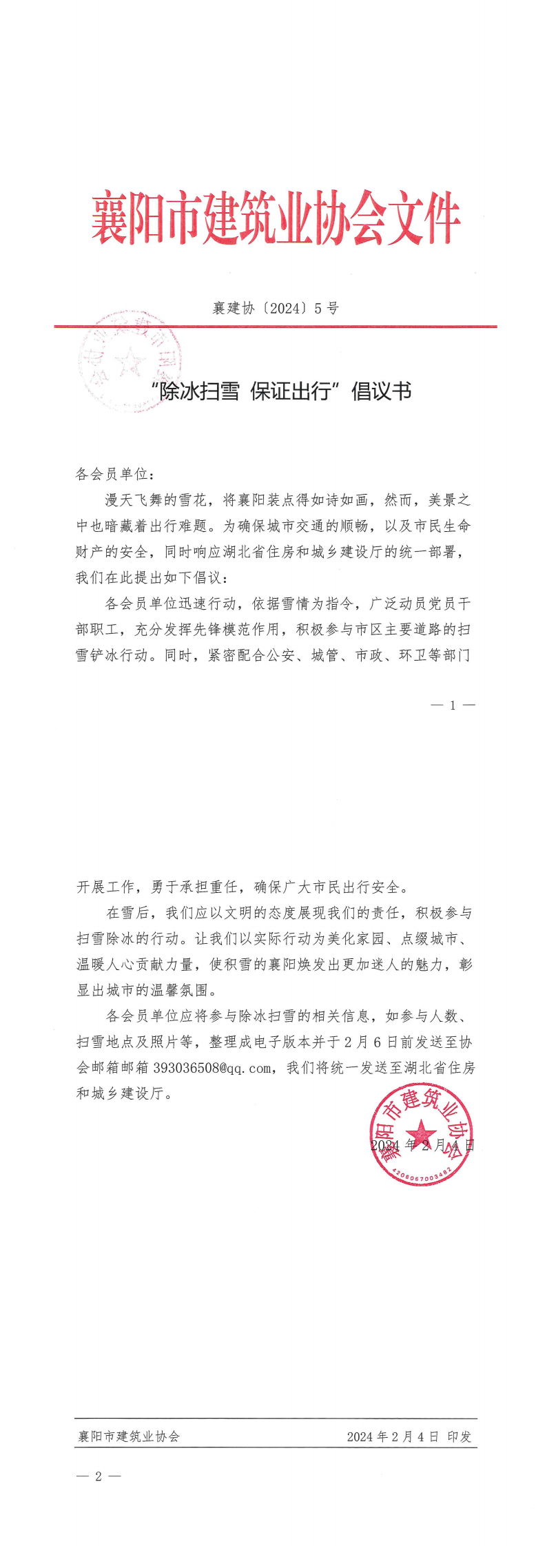 各會員單位應將參與除冰掃雪的相關信息,如參與人數、掃雪地點及照片等,整理成電子版本并于2月6日前發送至協會郵箱郵箱393036508@qq.com,我們將統一發送至湖北省住房和城鄉建設廳。