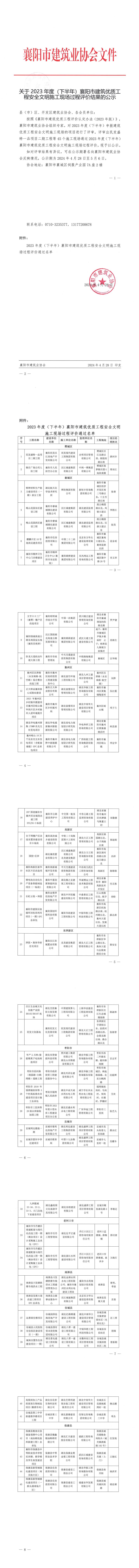 關于2023年度(下半年)襄陽市建筑優質工程安全文明施工現場過程評價結果的公示